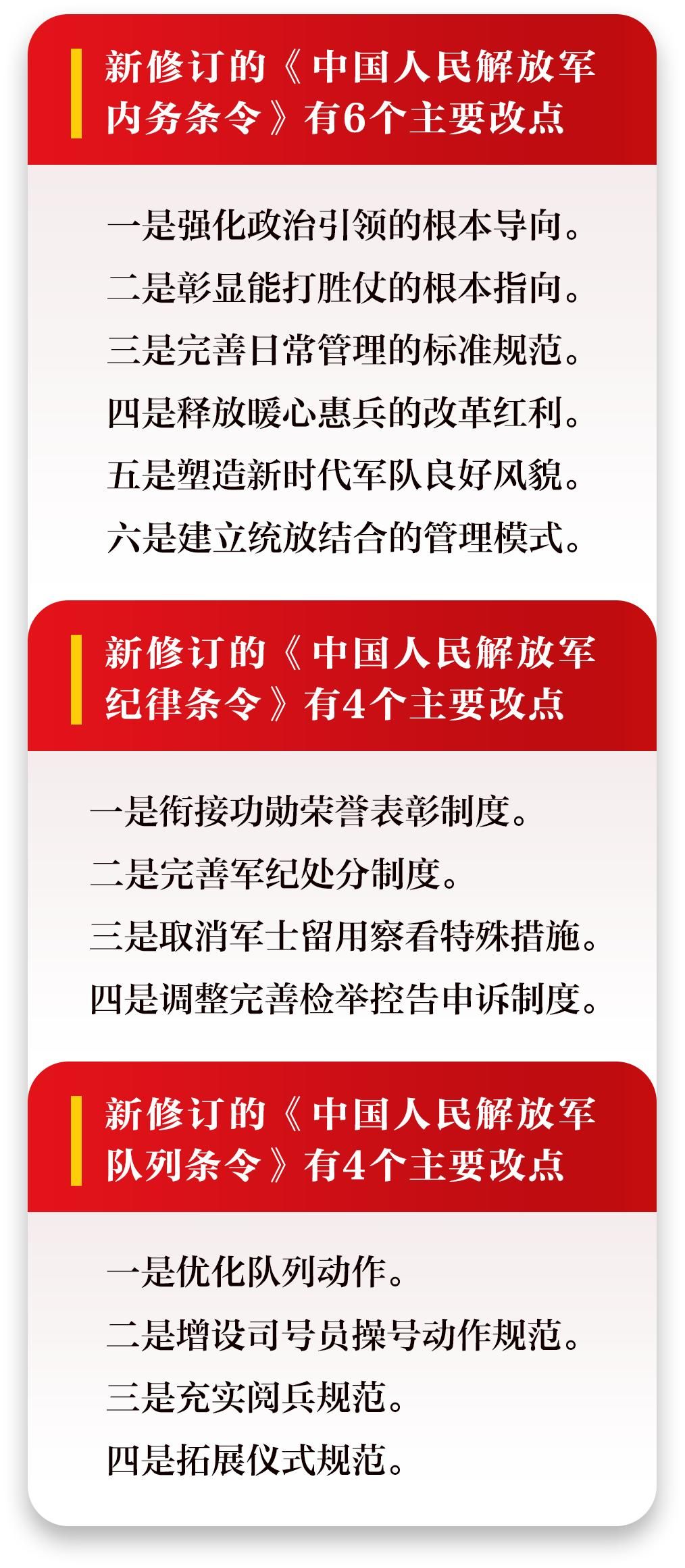 细览新修订的三大条令可以看到,这是一部坚持人民军队性质宗旨的条令、聚焦备战打仗的条令、严明军规军纪的条令、尊重官兵主体地位的条令。读懂了它,就读懂了人民军队的历史、现在和未来。
