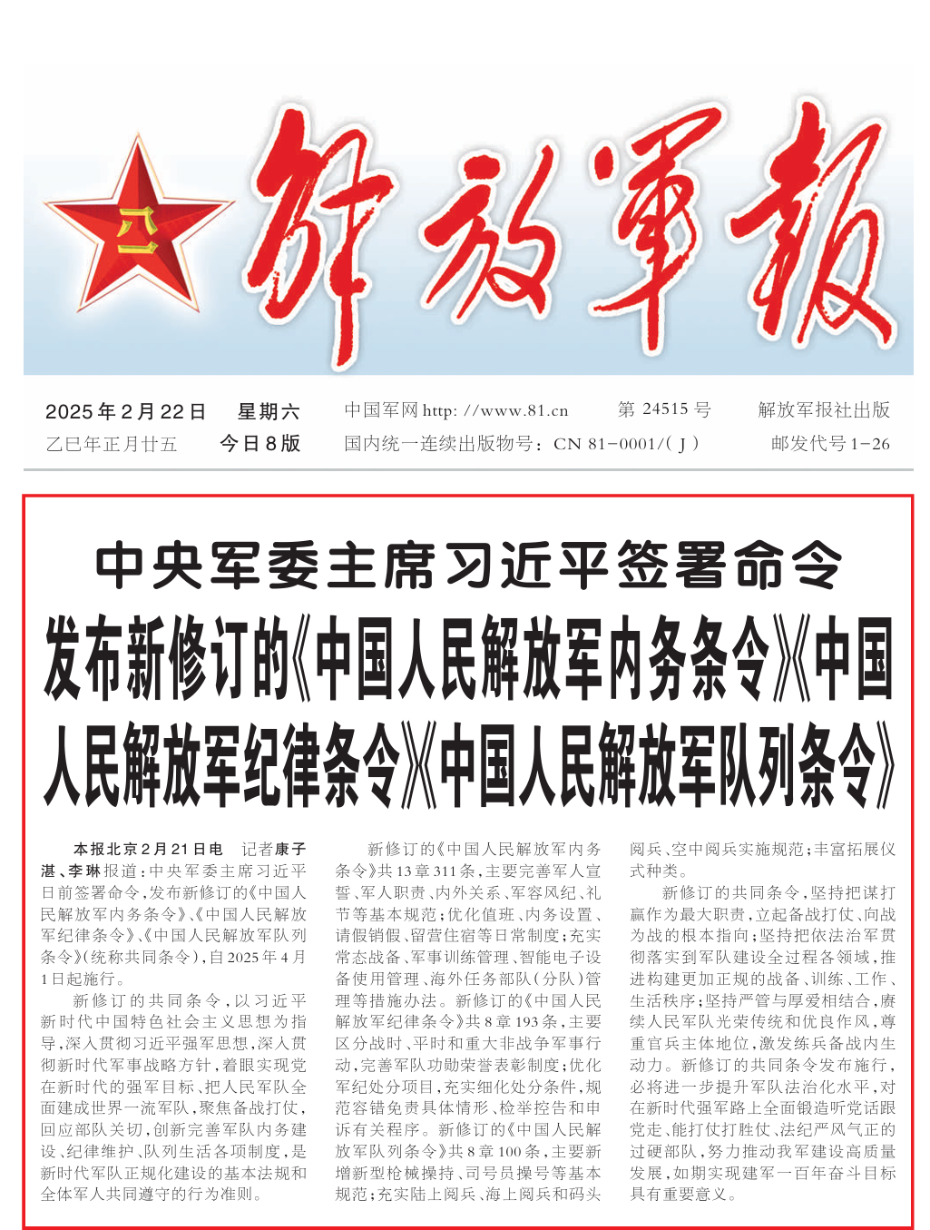 2025年的共同条令修订,贯彻习近平强军思想、聚焦备战打仗、适应改革重塑、推进管理理念方式创新,为锻造世界一流军队提供坚强的法制保障。