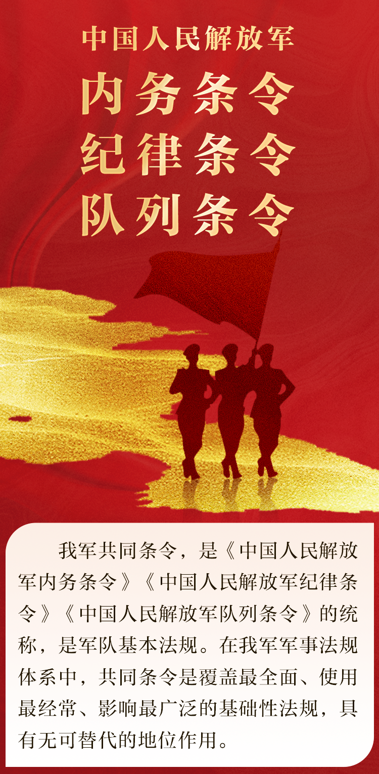 共同条令是《中国人民解放军内务条令》《中国人民解放军纪律条令》《中国人民解放军队列条令》的统称,是军队的基本法规。它覆盖军事活动的方方面面,大到我军性质宗旨、使命任务,小到穿衣戴帽、言谈举止,都有明确规定。无论将军还是士兵,不论是演习演练,还是探亲休假时,都要遵照执行。