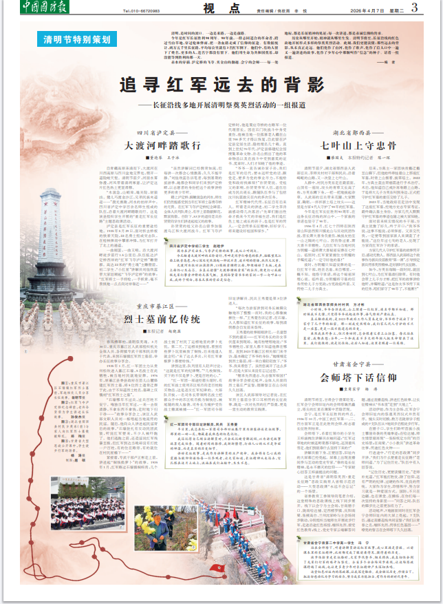 历史从哪里开始,精神就从哪里生发。清明节将至,长征沿线的红色故地开展形式多样的祭奠英烈活动。此刻,我们更能读懂:那些远去的背影,从未真正走远。他们化作了山河,化作了歌声,化作了后人口中一遍又一遍讲述的故事,化作了少年心中那颗叫作“信念”的种子。请看一组报道。