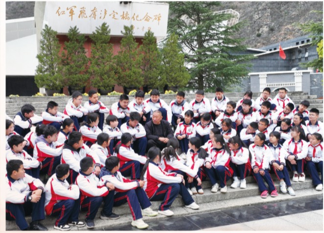 红军飞夺泸定桥纪念碑前,老兵孙贤荣为学生讲述长征故事。孙俊杰 摄