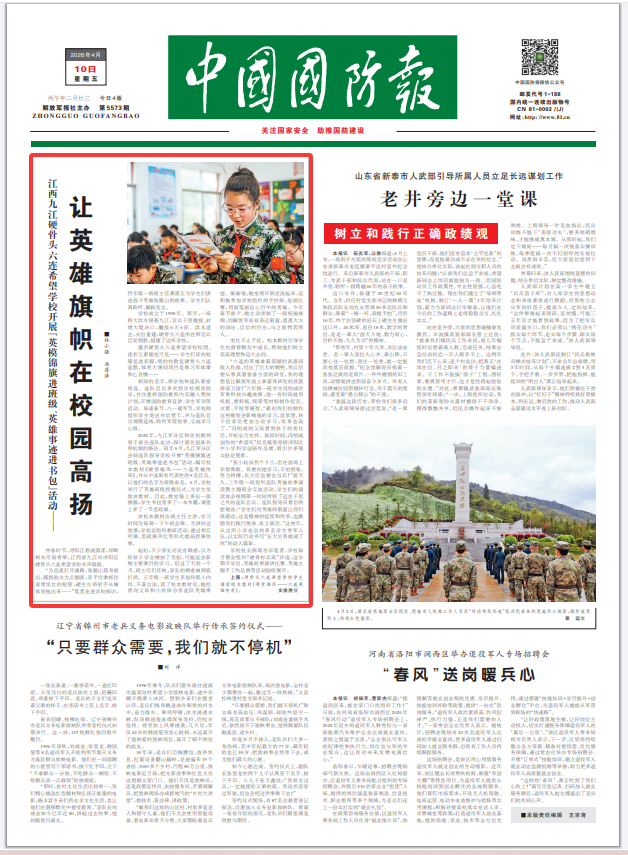 2025年,九江军分区和学校教师骨干前往连队走访,探讨固化创新共育机制的路径。同年5月,九江军分区会同连队指导学校开展“英模锦旗进班级、英雄事迹进书包”活动,编写校本教材《硬骨雄风——六连英雄传奇》,并从中选取有代表性的9名官兵,以他们的名字为班级命名。6月,学校举行了英雄班级授旗仪式,为学生发放该教材。自此,教室墙上多出一面锦旗,学生书包里多了一本书籍,课堂上多了一节思政课。