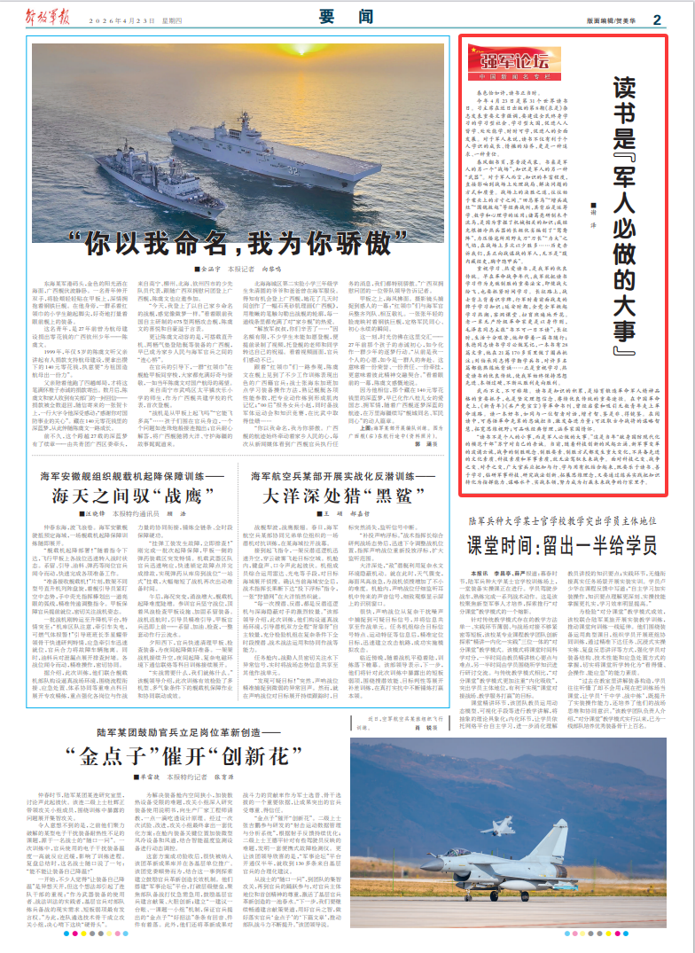 今年4月23日是第31个世界读书日。习主席在近日出版的第8期《求是》杂志发表重要文章强调,要建设全民终身学习的学习型社会、学习型大国,促进人人皆学、处处能学、时时可学,促进人的全面发展。对于军人来说,读书不仅有利于个人学识的成长、情操的培养,更是一种追求、一种责任。