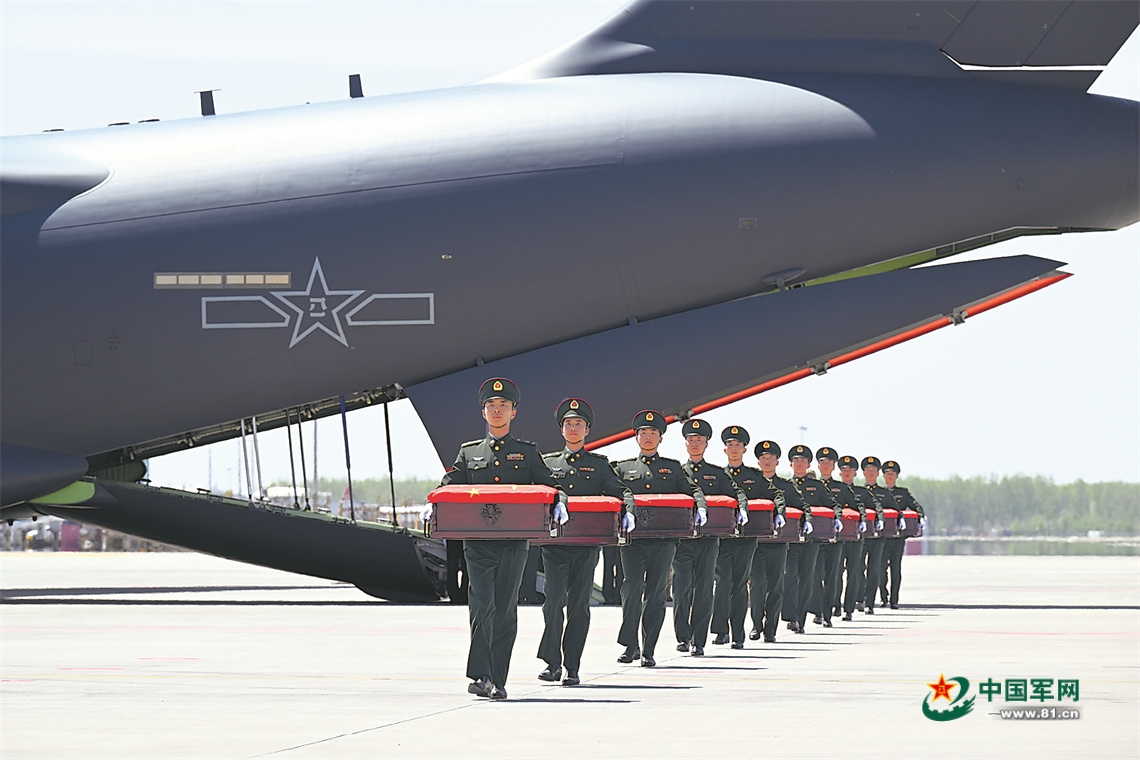 4月22日,礼兵护送志愿军烈士遗骸棺椁缓步走下运-20B专机。 余红春摄