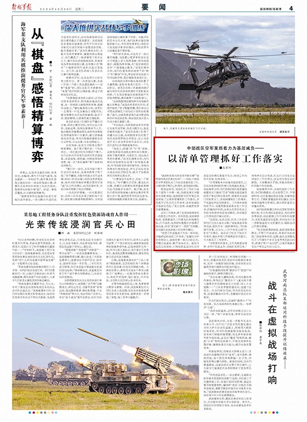 检查结束后,该旅机关工作组与连队干部骨干齐聚一堂,围绕发现的问题深刻剖析原因、查找根源并研究制订改进措施。“以清单管理抓好工作落实,不仅提升了机关的工作效率,还有效减轻了基层的负担。”走出会场,该连贾指导员感慨地说。