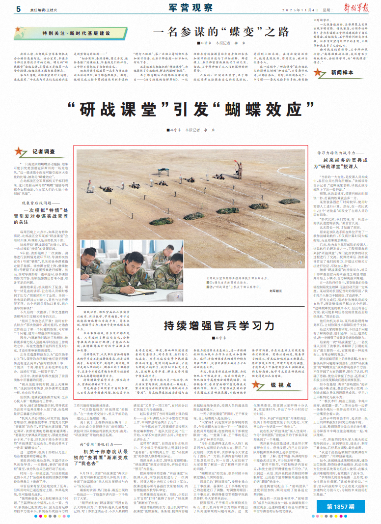在北部战区空军某部机关干部们看来,这只美丽而神奇的“蝴蝶”翅膀每周都会如期扇动,它在军人们的头脑中也刮起“风暴”。