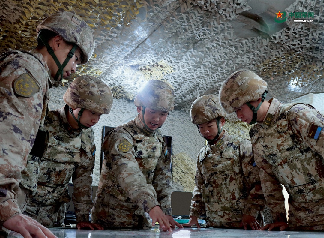 西部战区空军某部某机动分队官兵在帐篷里研究战法。陈明扬 摄