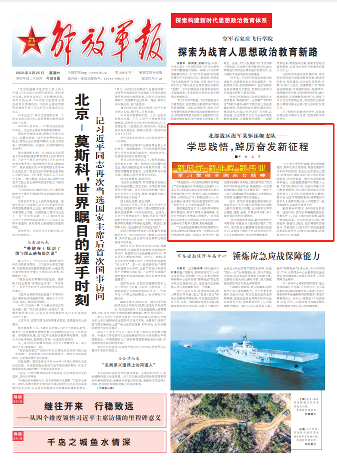 “巩固提高一体化国家战略体系和能力”“加快推进高水平科技自立自强”……连日来,北部战区海军某驱逐舰支队通过党委理论学习中心组学习、部队思想政治教育,认真传达学习十四届全国人大一次会议精神,教育引导官兵把思想和行动统一到党中央、习主席决策部署上来。