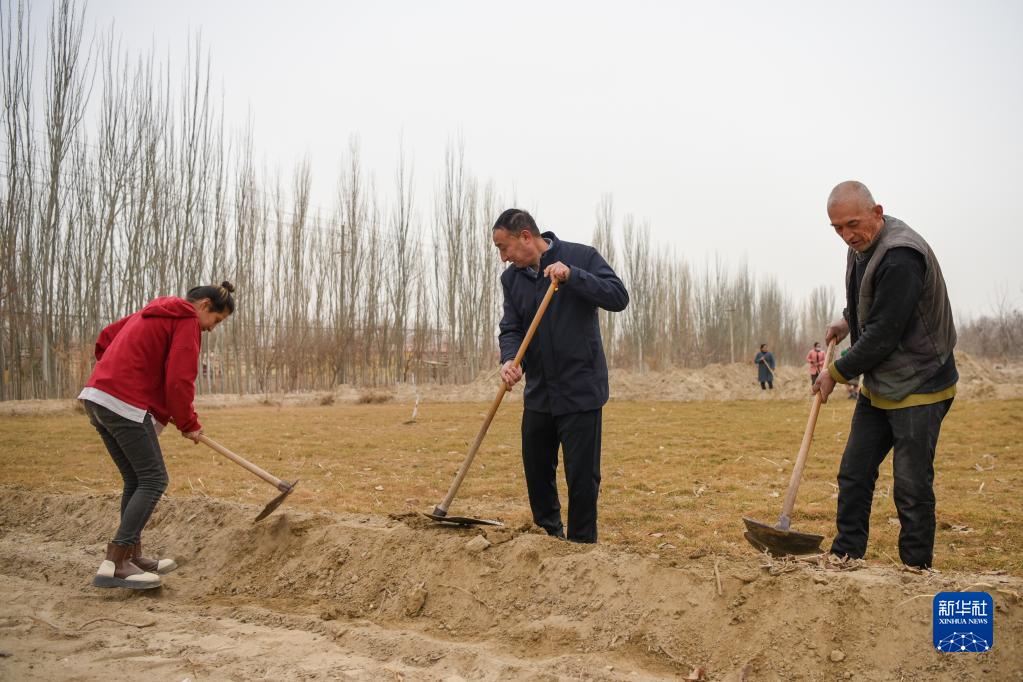 2月20日,在新疆和田地区策勒县巴什玉吉买村,买买提依布热依木·买买提明(中)和村民一起整理土地,为春耕生产做准备。 新华社记者 丁磊 摄