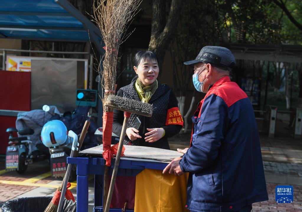 禹诚(左)在武汉市洪山区和平街爱家国际社区了解卫生排班情况(2月19日摄)。新华社记者 程敏 摄