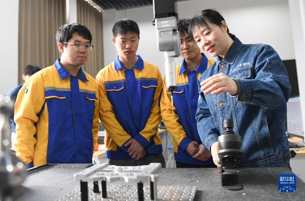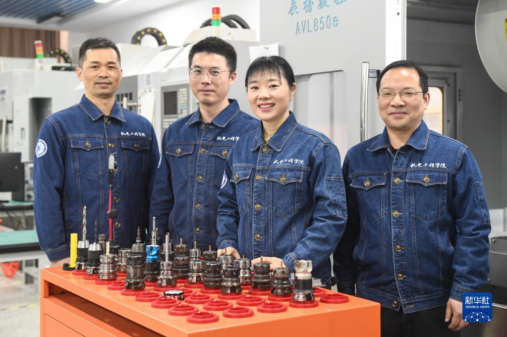 禹诚(右一)在学院指导学生操作机床(2月19日摄)。新华社记者 程敏 摄