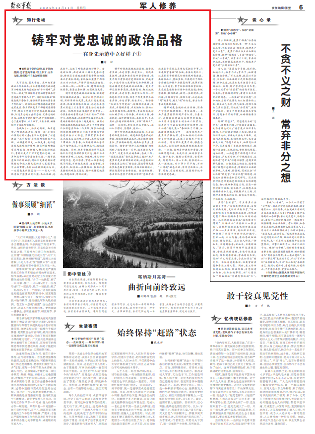 忠诚印寸心,浩然充两间。翻开党章,“对党忠诚老实,言行一致”是党员必须履行的义务;重温入党誓词,“对党忠诚”“永不叛党”是党员对党的庄严承诺。回顾党的历史,一路走来,我们党历经无数艰险和磨难,但任何困难都没有压垮我们,任何敌人都没能打倒我们,靠的就是千千万万党员的忠诚。从革命战争年代带着金条乞讨、一路寻找党组织的刘启耀,到和平发展时期把有限的生命投入到无限的为人民服务之中去的雷锋,再到60余载深藏功与名、一生跟党走的张富清……一代又一代优秀共产党员以身许党、无私奉献、忘我奋斗,立起了对党忠诚的好样子。奋进新征程,面对政治上错综复杂的考验,特别是当前政治建军需要解决的深层次矛盾和问题,军队各级党员干部都应以刀口向内、严整严训的政治自觉,一级抓一级,一级带一级,持续强化党性修养,肃清流毒积弊,永葆纯洁光荣。