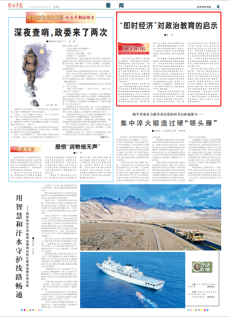 “即时经济”的突出优势在于能够快速地满足消费者的需要,而官兵的思想困惑往往具有一定的隐蔽性、动态性,要做到第一时间发现、第一时间应对并非易事。然而,苗头并非无迹可寻,许多“没想到”源于平时“不愿想”,许多“隐于内”的东西总会或早或迟、或多或少地“形于外”。我们常讲,“活动看兴趣、吃饭看饭量、睡觉看姿势、走路看神态”,就是要从细微处掌握官兵思想动态。干部骨干只有及时掌握官兵的急难愁盼和思想困惑,早把脉、早开方,才能将问题化解于未萌,将隐患化解于无形。