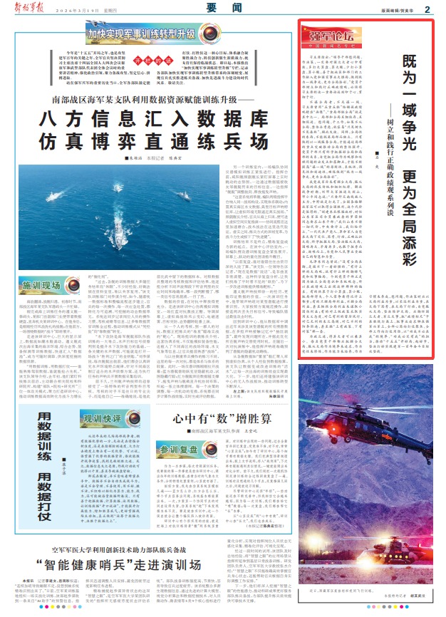 为政之道,得其大者可以兼其小。每名党员干部都应把顾全大局、服从大局作为境界来追求,作为党性来修炼,作为能力来培养,作为习惯来养成,想问题、作决策时应以大局利益为重,以长远利益为重,在大局下思考、在大局下行动,自觉服从大局、坚决维护大局。应胸怀国之大者、军之大事,把“政绩标尺”卡在胜战打赢上、把事业追求铆在强军兴军上,全部心思向打仗聚焦、全部工作向打仗用劲,以“功成不必在我”的境界、“功成必定有我”的担当,推动“十五五”开好局、起好步,坚决打好实现建军一百年奋斗目标攻坚战。