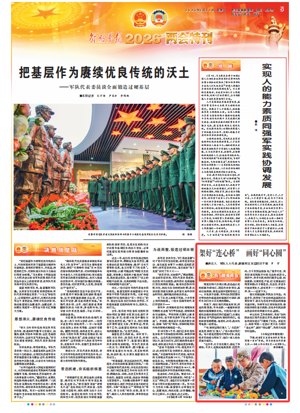 审议政府工作报告时,我在“加快民族地区现代化建设步伐,推进中华民族共同体建设”下面做了标注。新征程上,高原军民一定会以更大合力架好“连心桥”、画好“同心圆”,共同为祖国守好边防。