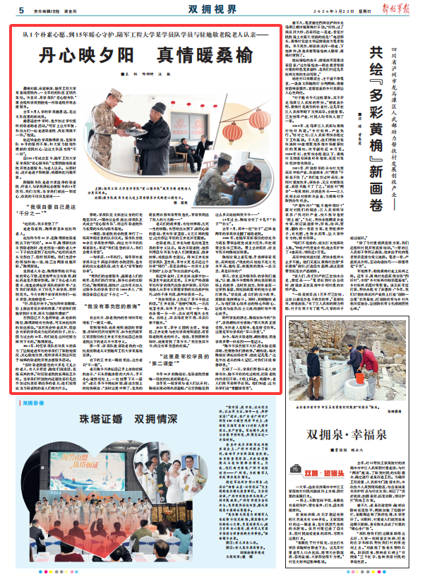 自2011年成立至今,陆军工程大学某学员队“爱心服务队”定期到驻地敬老院开展志愿服务,与老人认亲。从那时起,迷彩走进夕阳晚景,晚霞映红闪亮军徽。