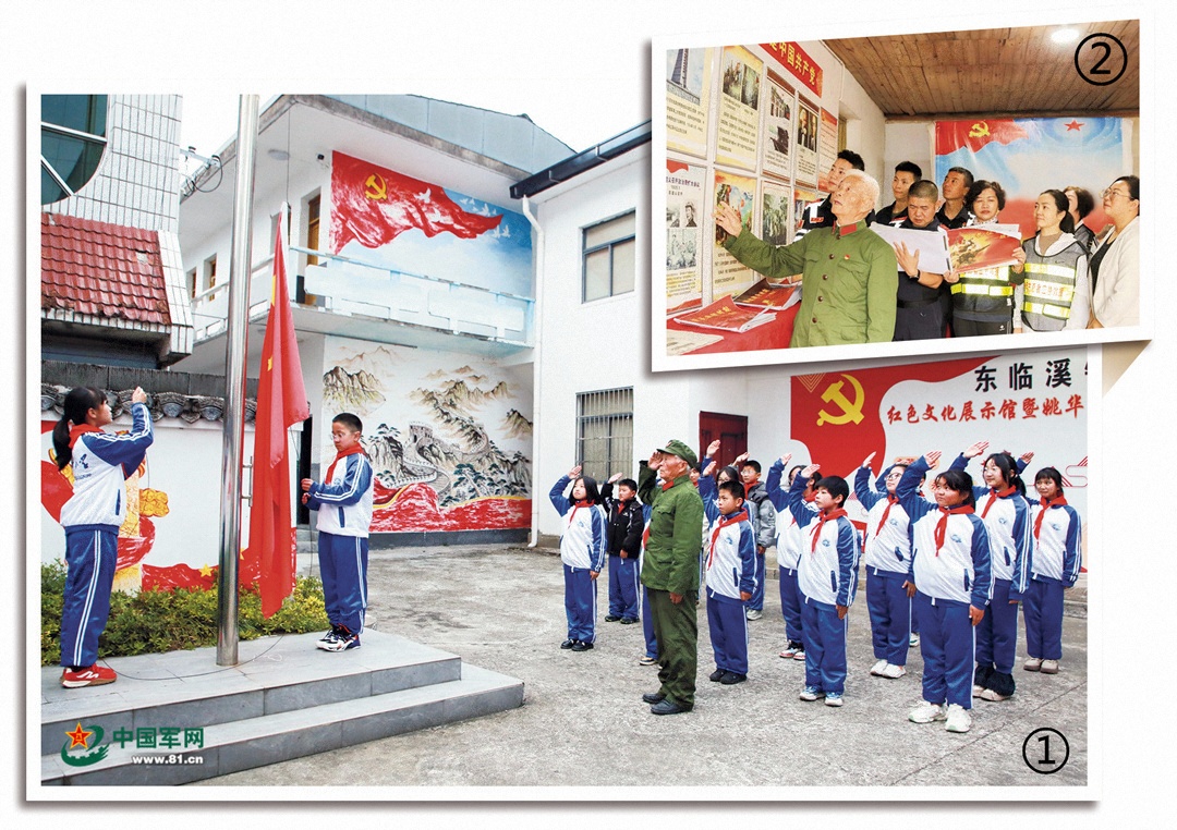 图①:11月24日,姚华亮应邀为安徽省休宁县汊口中心小学学生上国防教育课,并与学生一起到东临溪镇红色文化展示馆参加升旗仪式。武时化 摄