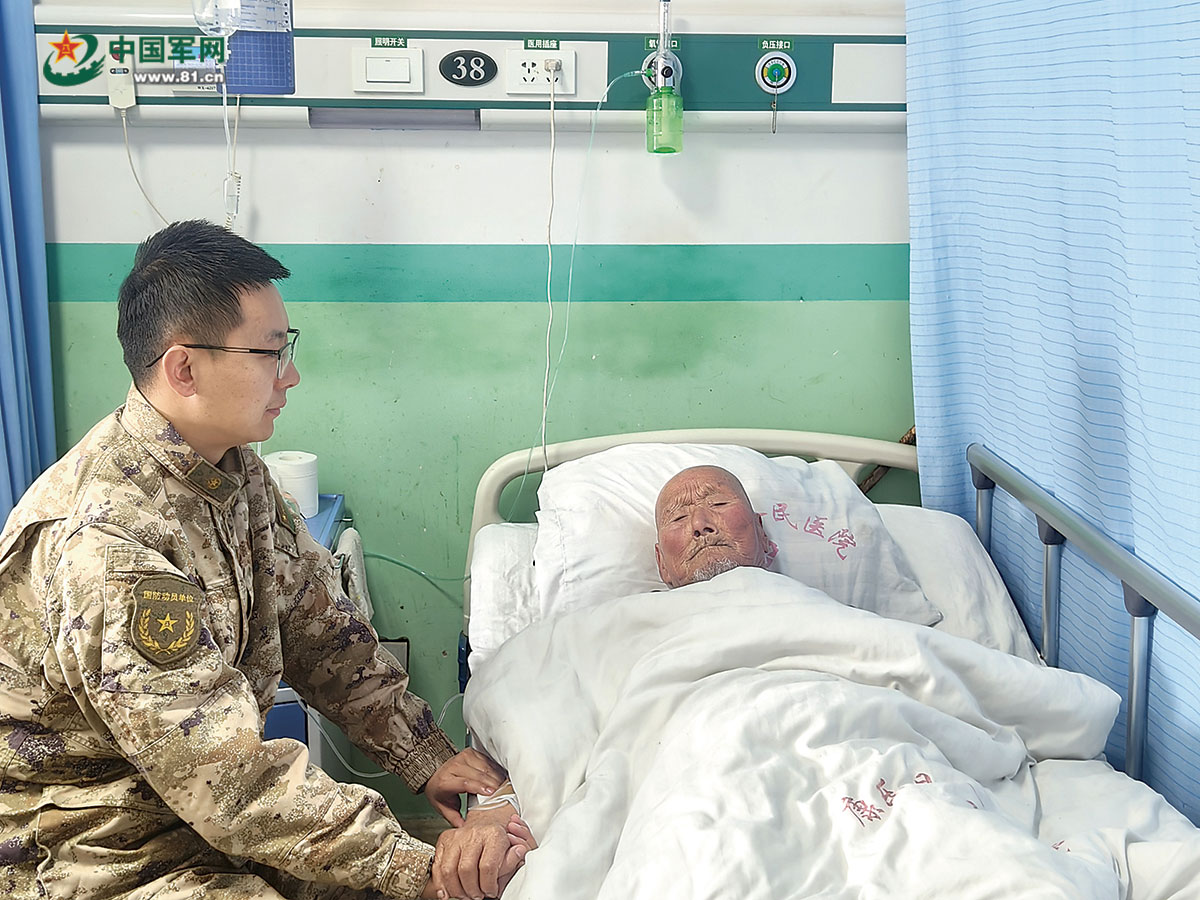 甘肃省康乐县人武部工作人员探望正在住院的马明礼老人(右)。