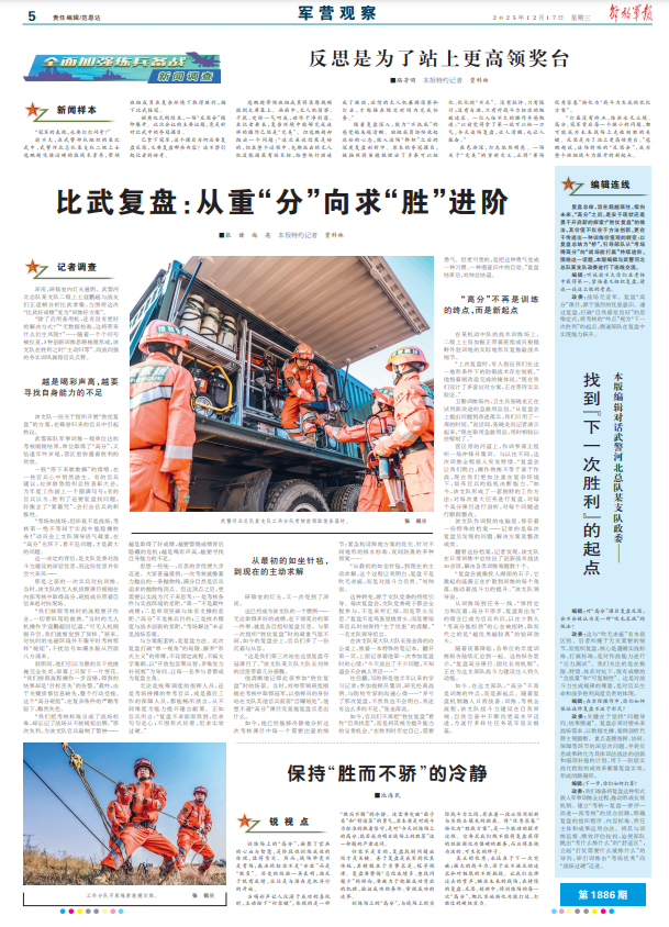 “打赢没有终点,练兵永无止境。高分、冠军背后每一个微小的问题,都可能成为未来战场上克敌制胜的关键。反思是为了站上更高领奖台。”寇鹏超说,这场特殊的“反思会”,成为整个班组战斗力提升的新起点。