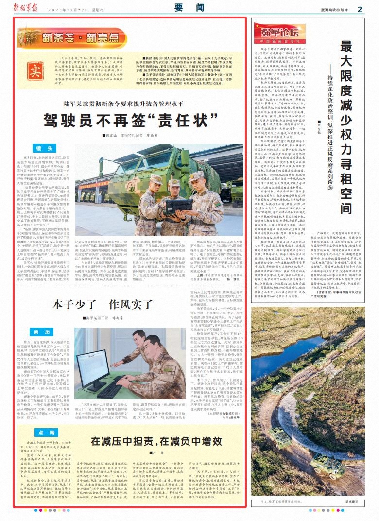 上面千条线,下面一根针。基层部队练兵备战任务繁重,日常业务工作事项繁多,千头万绪的工作都要靠基层落实。新条令从制度层面,明确规范登记统计事项、签写责任状等措施,推出一系列务实举措为基层持续减负,帮助官兵从繁杂事务中解脱出来,将更多时间精力投入谋战抓训中。