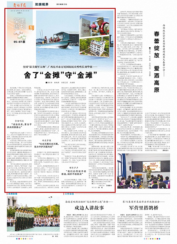 “民兵是解放军的助手和后备力量。”在哨所守护边境多年,刘华强不仅常年为边防官兵担任向导,还帮驻军部队协调解决水电保障难题。通过刘华强牵线搭桥,驻军部队与3所京族学校结成共建对子,创设“国旗下的国防法治课”,开展军地双拥活动70多场。