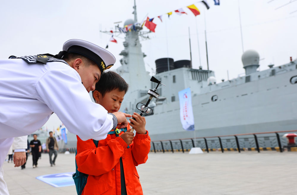 4月22日,一个小朋友在海军战士指导下体验使用三杯风向风速仪。新华社记者 方喆摄