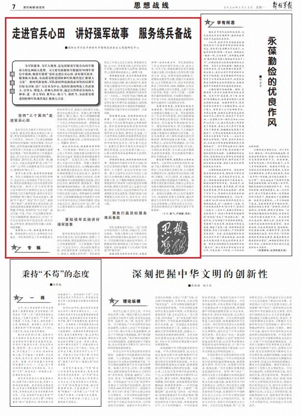 讲好担当奋进、牺牲奉献的时代故事。聚焦新时代强军兴军伟大实践,讲好官兵坚持政治建军、改革强军、科技强军、人才强军、依法治军的奋斗故事。要大力宣传官兵在平凡岗位上创造不凡业绩的感人事迹,讲好官兵舍小家顾大家、甘于牺牲奉献的家国情怀,展现新时代革命军人的价值追求和精神风貌,展现人民军队全心全意为人民服务的宗旨意识,突出宣传新时代以来涌现的各类先进典型,用他们的奋斗故事激励官兵担当作为、奋发有为,为实现党在新时代的强军目标凝聚智慧和力量。
