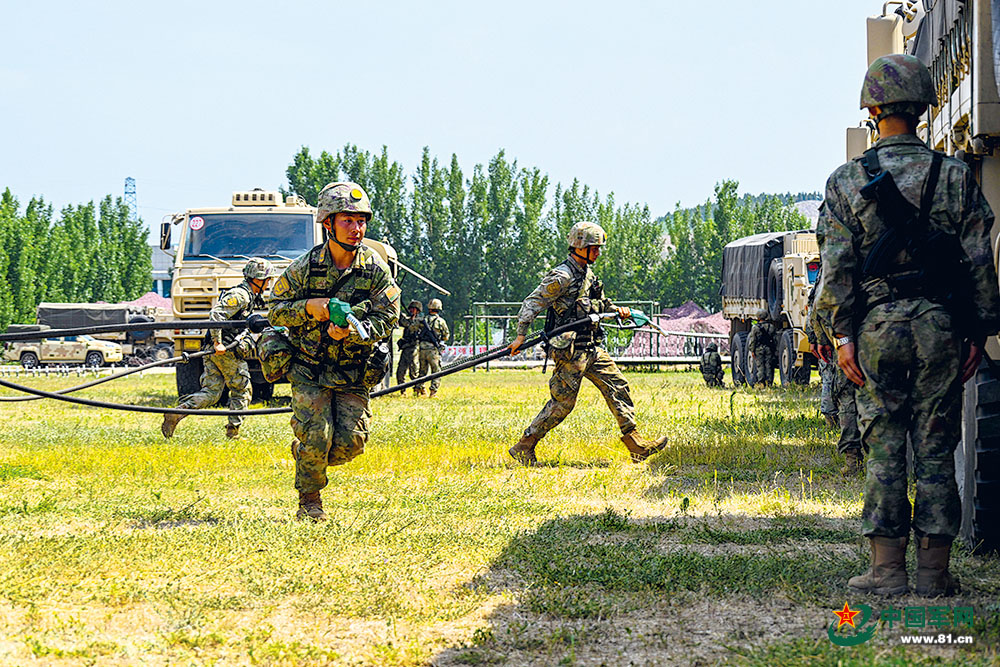 输油组依据回传数据制订保障方案、确定补给线路,一边在关键节点配置油泵,一边派出野战加油车疾驰至预定补给地域。当受供车队到达时,野战加油车的多路管线已铺开(图②),10多分钟便完成对整个车队的油料补给。