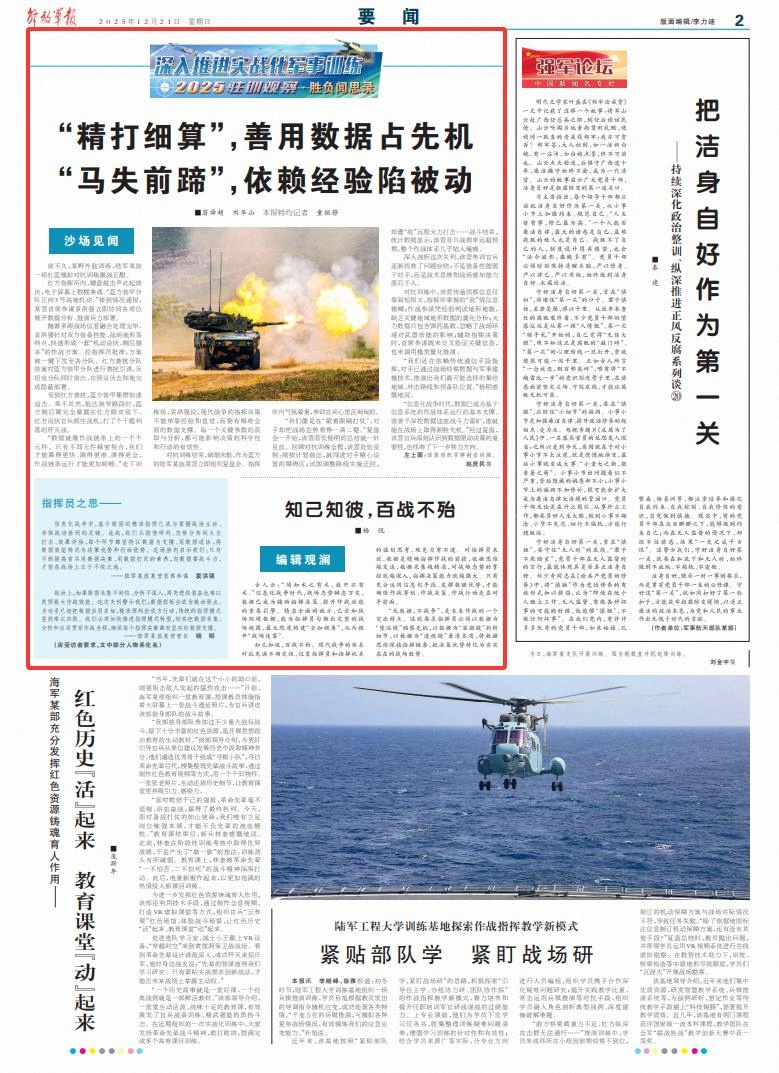信息化战争中,基于数据的精准指挥已成为掌握战场主动、夺取战场胜利的关键。此战,我们从敌情研判、态势分析到火力打击、效果评估,每个环节都坚持以数据为支撑、用数据说话,将数据效能转化为决策优势和行动优势。这场胜利启示我们:只有不断提高官兵用数据决策、用数据打仗的素养,向数据要战斗力,才能在战场上立于不败之地。