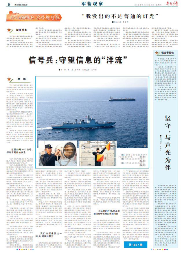 在跟这群信号兵接触的过程中,记者逐渐认识了这个群体。他们是现代海战中低调却关键的战斗岗位。他们的存在,确保了舰艇在任何情况下都“看得见、联得上、说得通”,是舰上指挥系统不可或缺的延伸。伴随着海军舰艇驶向深蓝,信号兵的作用也愈发突出。他们不仅成为中外海军交流的桥梁,更在远海大洋擦亮了中国海军的名片。
