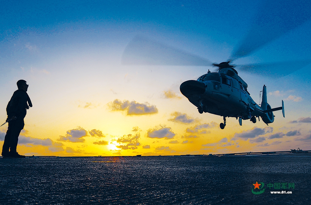 “建立着舰航线,调整姿态!”收到坐标信息,战机迅速锁定目标舰船。甲板上,保障人员早已就位。在信号员引导下,战机建立下滑线,缓慢降低高度,减速飞行,找准时机果断下降,稳稳降落在甲板上。短暂停留后,战机再次升空,飞赴其他空域开展协同反潜、搜救等训练。