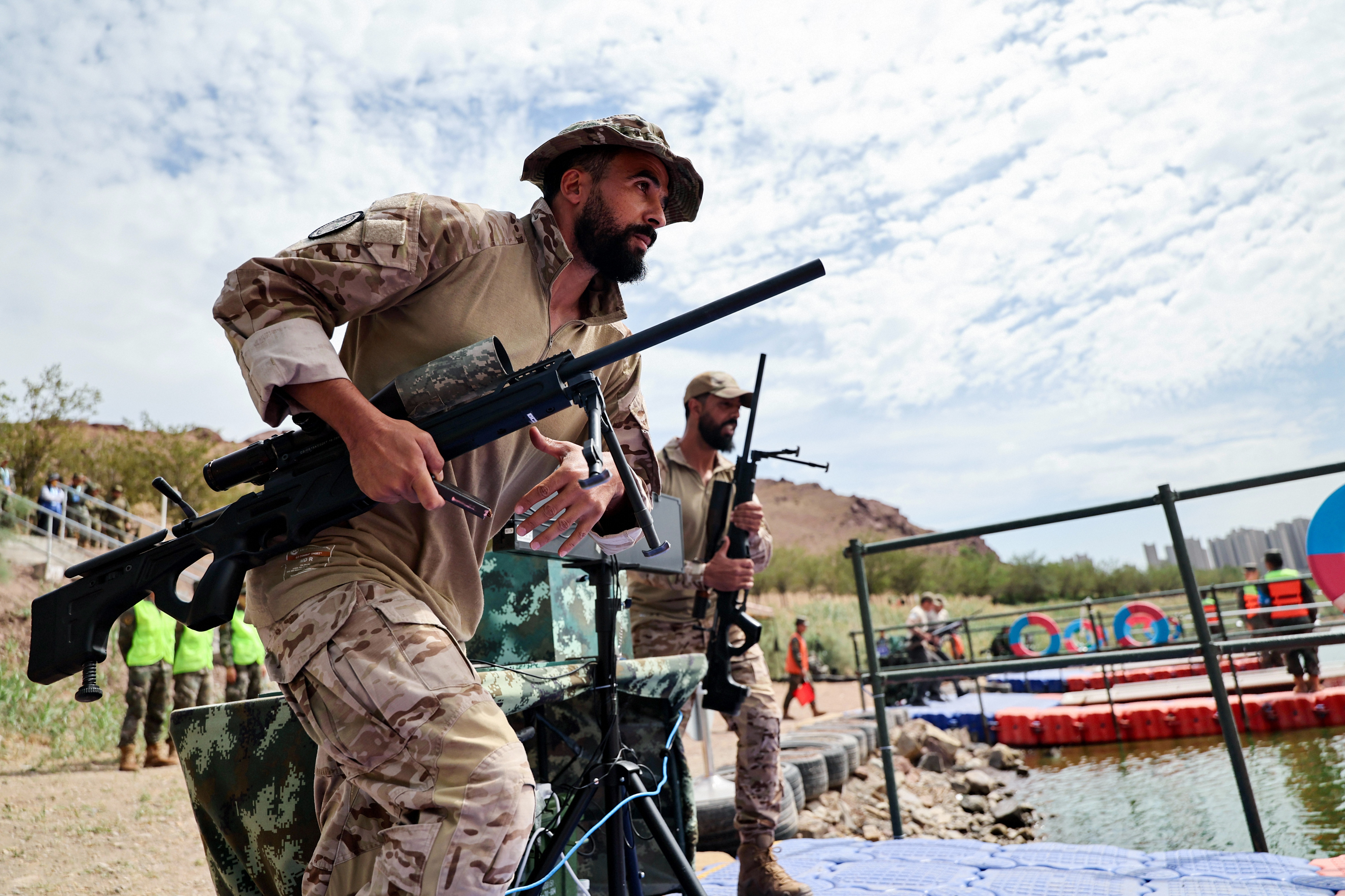 7月16日上午,在位于新疆乌鲁木齐的武警部队某训练基地,参加“锋刃-2025”国际狙击手射击竞赛的各国参赛队员展开激烈角逐。图为突尼斯参赛队员在“搭乘舟艇水上狙击”课目竞赛中自信走下赛场。侯崇慧 摄
