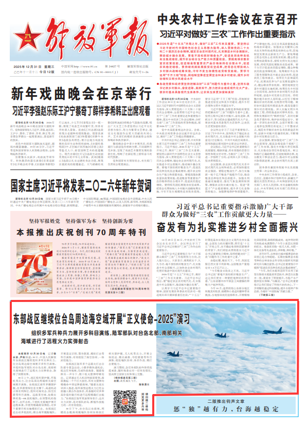 解放军报南京12月30日电 记者侯永波、尹航报道:30日,中国人民解放军东部战区继续组织多军兵种兵力,位台岛周边海空域展开多科目演练,并组织陆军部队对台岛北部、南部相关海域进行了远程火力实弹射击,取得了预期效果。