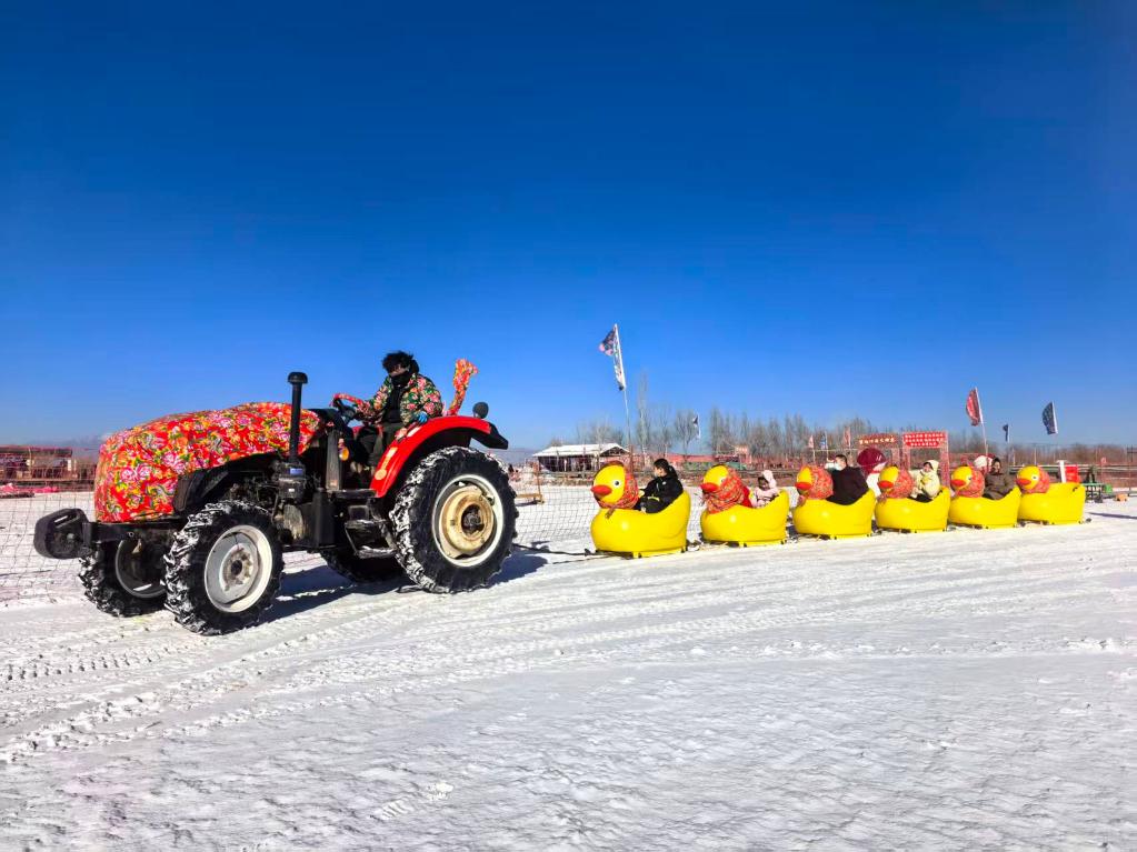 1月10日,游客在四十里店村的稻渔空间体验冰雪游乐项目。新华社记者马丽娟 摄