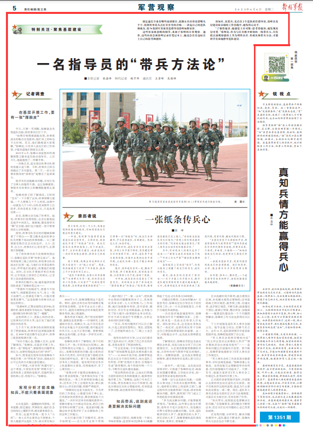 “了解得越多,越感觉士兵可敬;思考得越深,越发现基层可爱。”张峰说,作为与官兵朝夕相处的一线带兵人,只有把点滴观察感悟上升为理性认识、形成具体带兵方法,才能科学有效地指导连队建设。