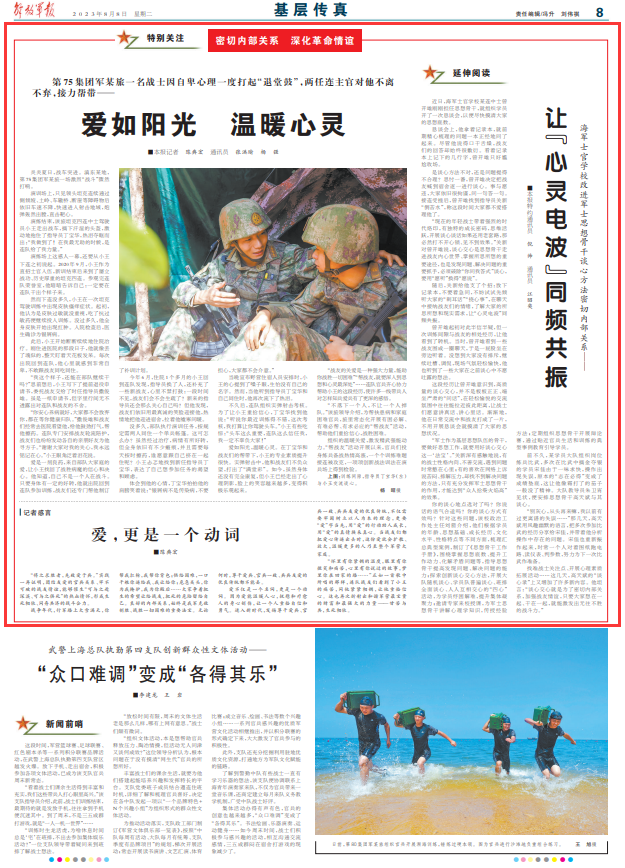 爱不仅是一个名词,更是一个动词。因为爱能温暖人心,抚慰和疗愈人的身心创伤,让一个人重拾自信和勇气。进入新时代,发扬尊干爱兵、官兵一致、兵兵友爱的优良传统,不仅需要牢固树立以人为本的理念,更要“爱”字当先,用“爱”的行动助人成长,用“爱”的真情换来真心。当战友们都把爱心传递出去时,这份爱就会扩散、放大,温暖更多的人乃至整个军营大家庭。