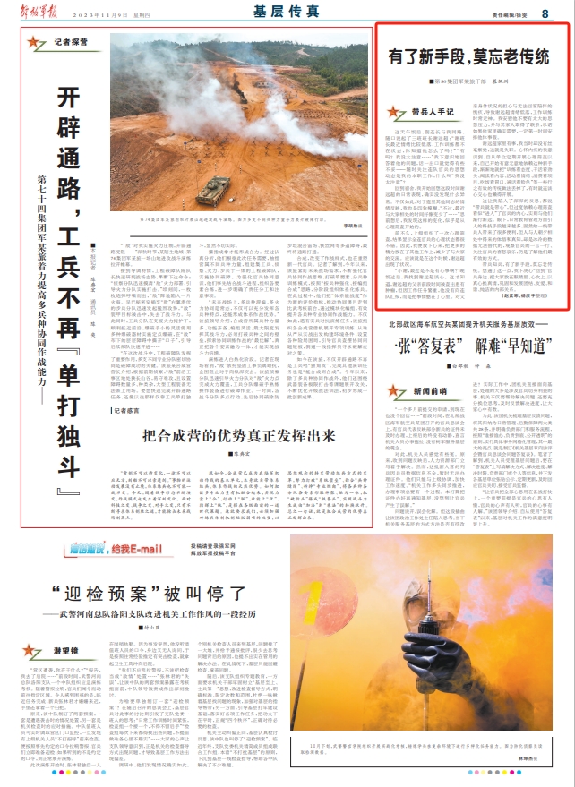 带兵知兵,有了新手段,莫忘老传统。想通了这一点,我下决心“回到”官兵身边,把大家放在眼睛里、心坎上,以真心换真情,巩固和发展团结、友爱、和谐、纯洁的内部关系。