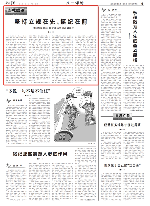 “欲知平直,则必准绳。欲知方圆,则必规矩。”立规在先、挺纪在前,目的是严格约束、严格监督、严格管理,实质是对党员干部真正负责,做到严管和厚爱相统一,防止一些党员干部今天是“好干部”,明天是“阶下囚”。党的十八大以来,针对一个时期部队管理松懈、作风松散、纪律松弛等问题,我军开展了一场政治整训的攻坚战。这场新时代的政治整训,贯彻整风精神,坚持路线这个“王道”与纪律这个“霸道”相结合,坚持立规在先、挺纪在前,以正风肃纪反腐为重点,以加强政治巡视和政治监督为手段,以严密的党纪军规体系为规范,用铁的纪律凝聚铁的意志、锤炼铁的作风、锻造铁的队伍。