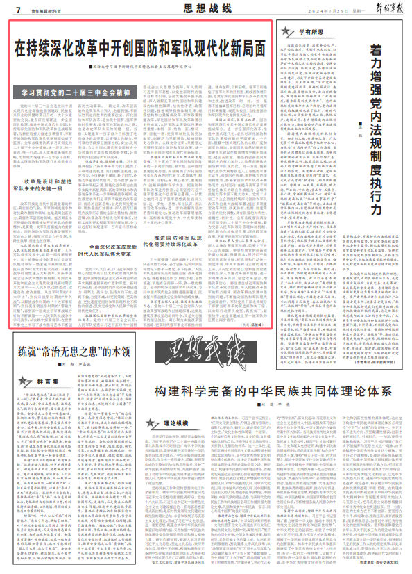 强国必强军,强军必改革。国防和军队现代化是中国式现代化的重要组成部分。进一步全面深化改革、推进中国式现代化,必然对深化国防和军队改革提出新的更高要求。一方面,随着中国式现代化的实践广度和深度的增加,全面深化改革的新进展需要我军建设在提质增效中跑出加速度、建出高质量。要坚持创新在我军建设中的核心地位,以改革创新推进国防和军队现代化。另一方面,随着现代战争实践特别是人工智能的军事化运用,战争内在机理、制胜模式的深刻转变等,都要求国防和军队改革乘势而为、应时而动,在提升我军基于网络信息体系的联合作战能力、全域作战能力等方面下更大功夫。党的二十届三中全会围绕持续深化国防和军队改革作出重大战略部署,提出多项重要改革举措,涉及体制、机制、制度等方面的优化调整,具有很强的时代性、前瞻性、针对性。全军各级要认真学习贯彻党的二十届三中全会精神,着力完善人民军队领导管理体制机制、深化联合作战体系改革、深化跨军地改革,不断开创强军兴军新局面。