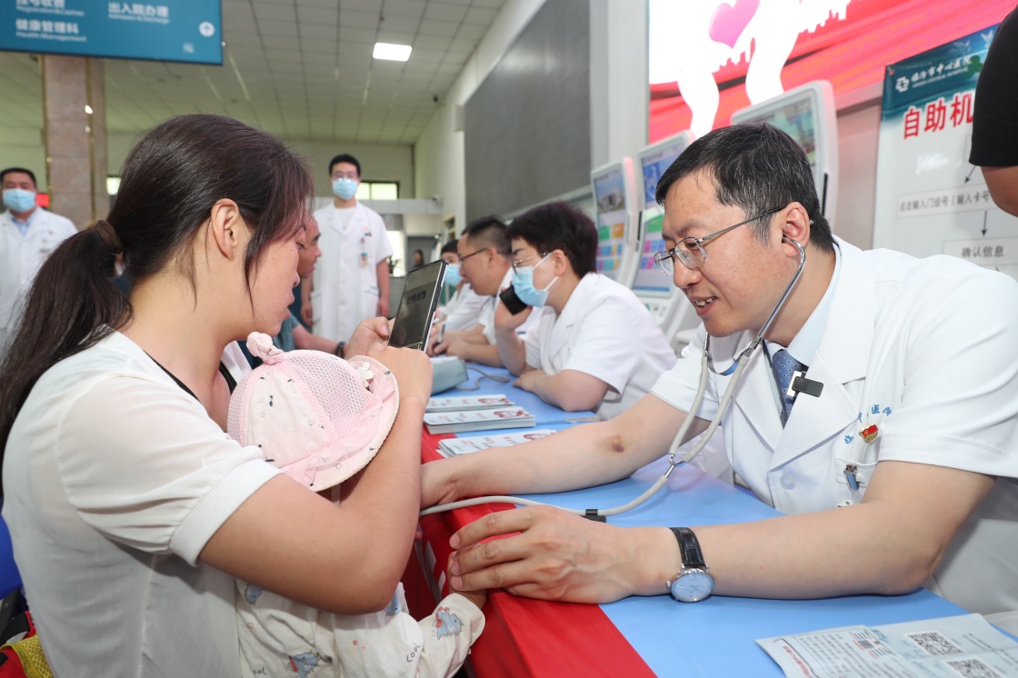 在临汾市中心医院,刘辉(右)在义诊中为一名儿童检查(2024年6月18日摄)。