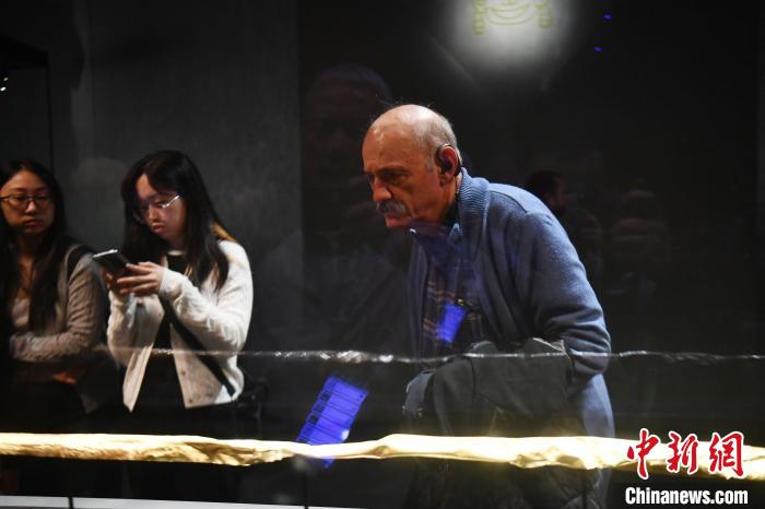 图为专家学者在三星堆博物馆参观金杖。中新社记者 张浪 摄