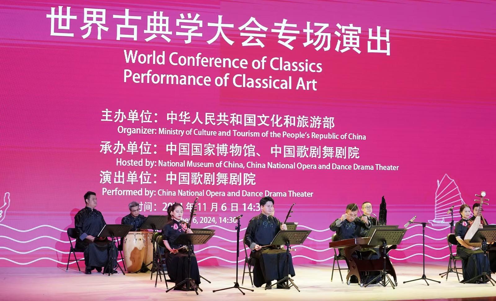 11月6日下午,世界古典学大会专场演出在中国国家博物馆上演,中外与会嘉宾共同欣赏了中国歌剧舞剧院艺术家带来的精彩演出。中国舞、中国古曲与希腊经典曲目交相辉映,在舞台上共筑文明互鉴的新桥梁。