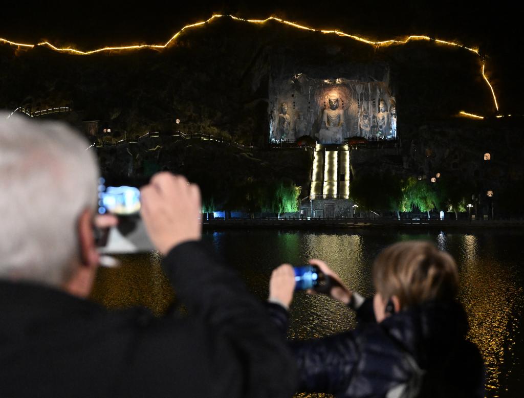 11月4日,外宾在河南省洛阳市龙门石窟景区礼佛台拍照留念。新华社记者 李嘉南 摄