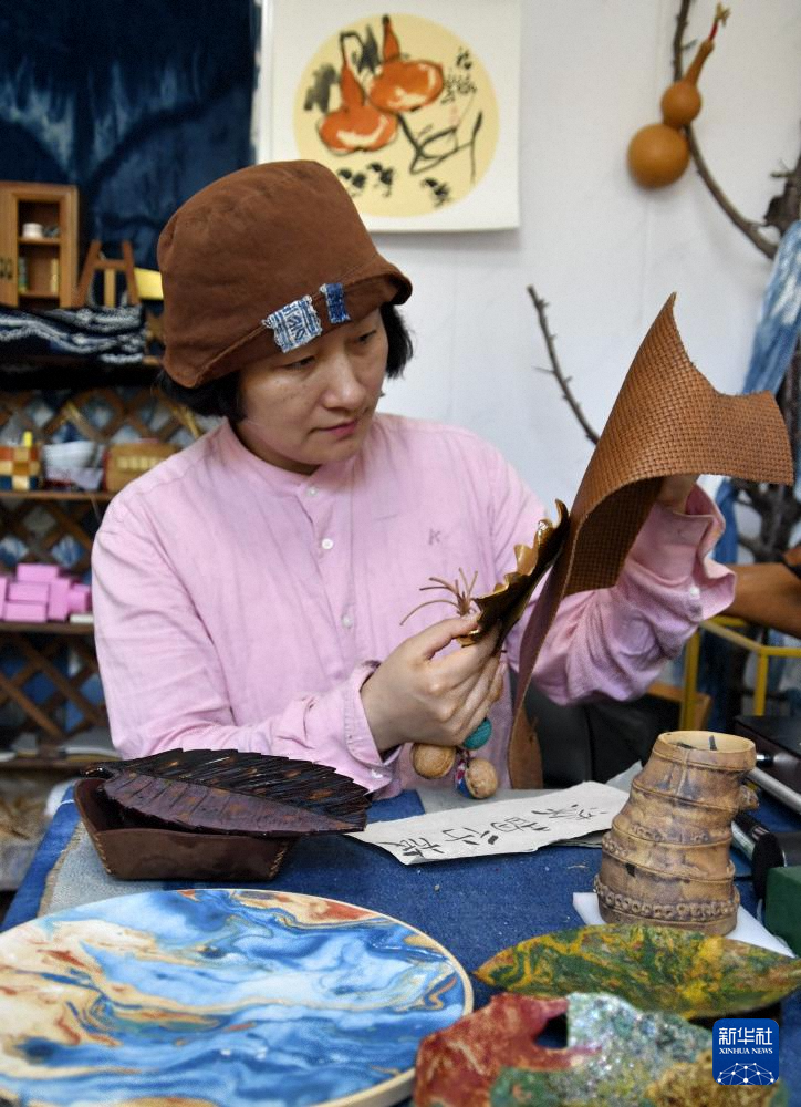 在怀柔区桥梓镇禧宝露文化中心,髹漆皮艺技师任捷在研究皮艺制作的原材料(8月6日摄)。新华社记者 李欣 摄