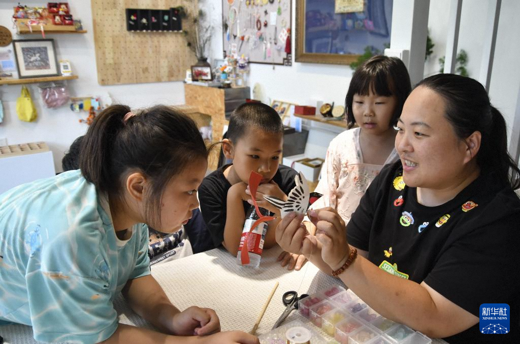 在怀柔区桥梓镇禧宝露文化中心,孩子们了解北京市级非物质文化遗产代表性项目沙燕吉祥鸟的制作技艺(8月6日摄)。新华社记者 李欣 摄