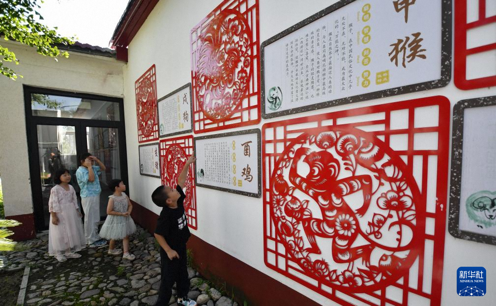 在怀柔区桥梓镇禧宝露文化中心,孩子们观看剪纸技艺十二生肖墙(8月6日摄)。新华社记者 李欣 摄
