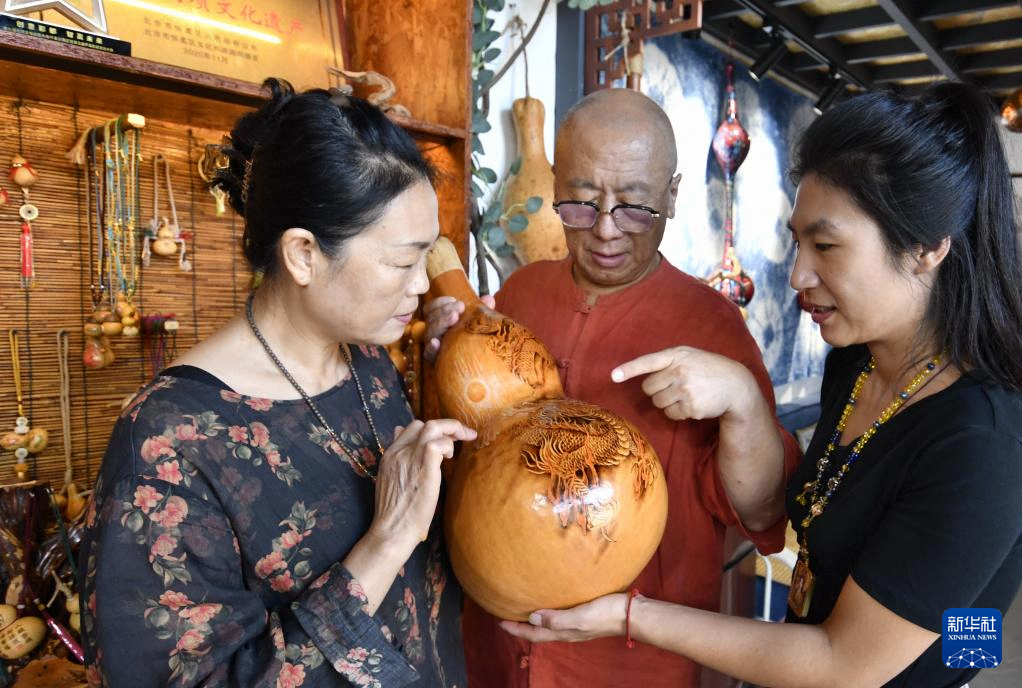 在怀柔区桥梓镇禧宝露文化中心,怀柔区非物质文化遗产焦家浸烙葫芦代表性传承人焦宇(中)为来宾讲解烙制葫芦的技艺(8月6日摄)。新华社记者 李欣 摄