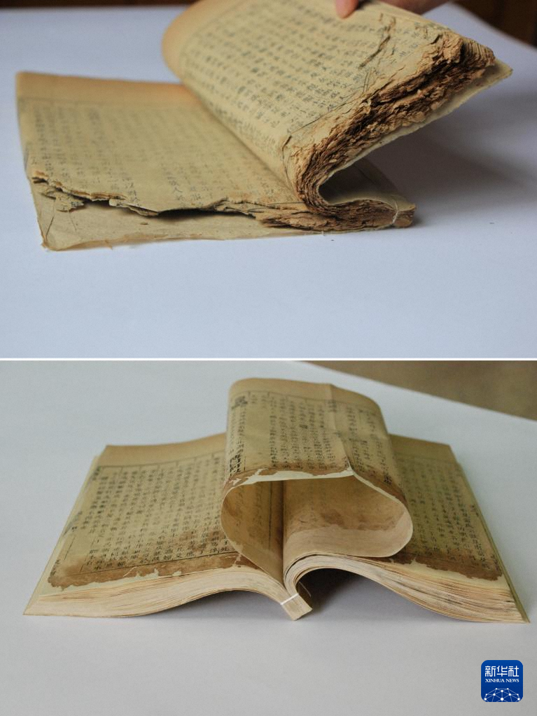 这是古籍修复前后的对比图(上图为修复前的古籍,下图为修复后的古籍)。新华社发(安徽省图书馆供图)
