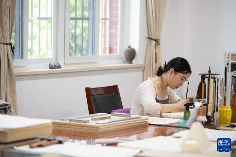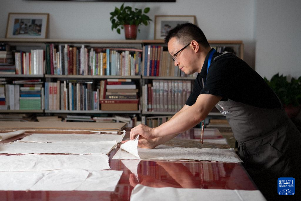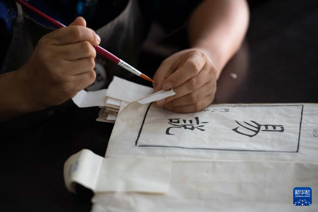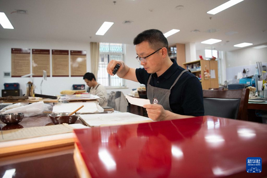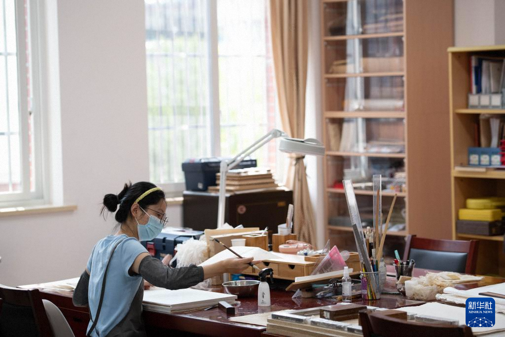 6月17日,在安徽省图书馆内,古籍修复师金鑫在进行古籍修复。新华社记者 张端 摄