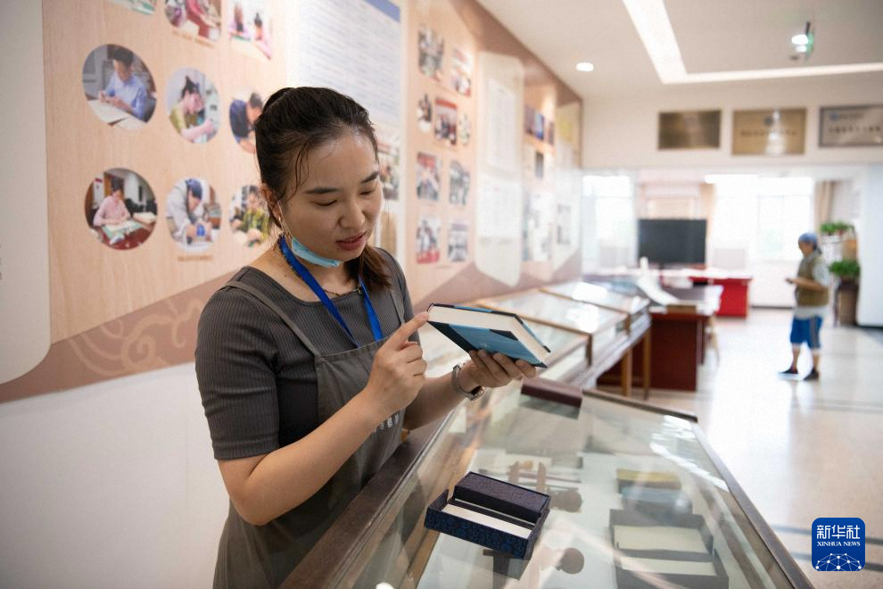 8月5日,在安徽省图书馆内,古籍修复师耿宁在介绍书籍装帧形式。新华社记者 张端 摄